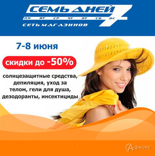 7 и 8 июня 2018 г. в сети магазинов парфюмерии, косметики и бытовой химии «Семь дней» на солнцезащитные средства, товары для депиляции, для ухода за телом, гели для душа, дезодоранты и инсектициды действуют скидки до 50%!