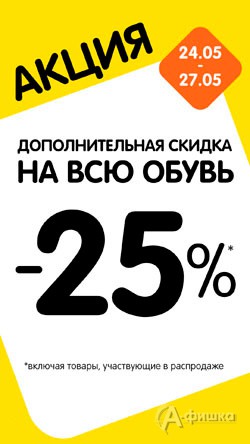 До 27 мая 2018 г. в магазинах «Детский мир» Белгорода действует дополнительная скидка 25% на весь ассортимент детской обуви (в том числе на товары из распродажи)!