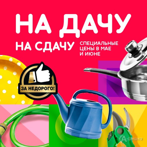До 12 июня 2018 г. в магазине товаров для дома «Посуда Центр» проходит акция «На дачу – на сдачу» – специальные выгодные цены на товары для сада, огорода и пикника!
