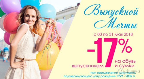 В магазинах обуви и аксессуаров «Helmar» и «Rieker» до 31 мая 2018 г. проходит акция «Выпускной мечты» – для выпускников скидка 17% на обувь и сумки!