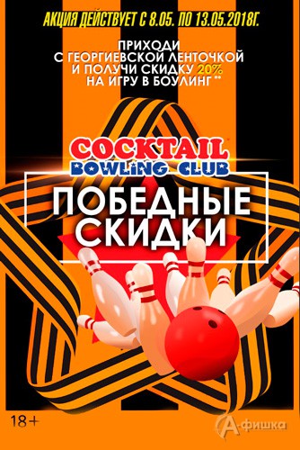 В боулинг-клубе «Коктейль» праздничная акция – до 13 мая 2018 г. действуют победные скидки! Приходи с георгиевской ленточкой и играй в боулинг в любое время со скидкой 20%!