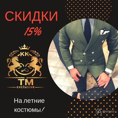 В магазине мужской стильной одежды «TM Exclusive» в Белгороде проходит акция «Скидка на лето» – до 15 мая 2018 г. скидка 15% на все летние костюмы!