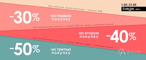 С 1 по 31 мая 2018 г. в магазине сумок и аксессуаров «Bags etc» в Белгороде акция – скидки от 30 до 50% на весь ассортимент!