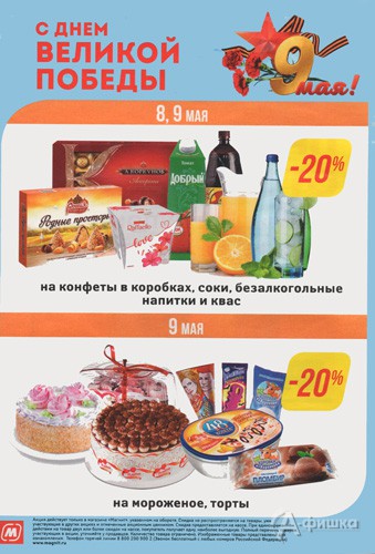 8 и 9 мая 2018 г. в универсамах «Магнит» проходит праздничная акция – скидка 20% на конфеты в коробках, соки, безалкогольные напитки и квас. 9 мая 2018 г. скидка 20% на мороженое и торты.