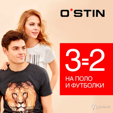 В магазинах одежды «O’stin» и «O’stin Kids» только до 14 мая 2018 г. акция «3=2» на вещи из категории «поло, топы и футболки» из женской, мужской и детской коллекций – третья в подарок!