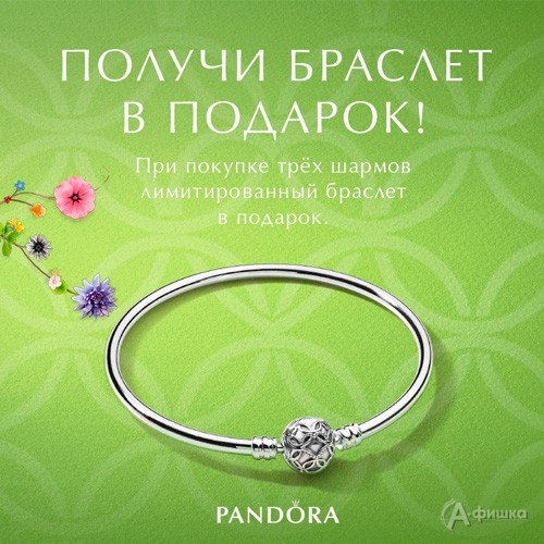 В ювелирных салонах «Pandora» до 25 апреля 2018 г. проходит акция «Получи браслет в подарок» – при покупке трёх шармов лимитированный браслет в подарок!