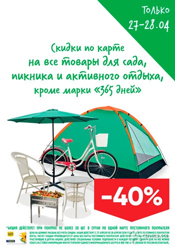В гипермаркетах «Лента» в Белгороде только 27 и 28 апреля 2018 г. будет действовать скидка 40% на все товары для сада, пикника и активного отдыха по карте «Лента»!