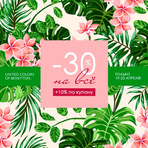 В магазине одежды «United Colors Of Benetton» в Белгороде проходит акция – только до 22 апреля 2018 г. скидка 30% на всё!
