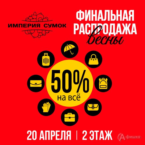 Только 1 день, 20 апреля 2018 г. в магазине «Империя сумок» пройдёт финальная распродажа весны – на всё скидка 50%!