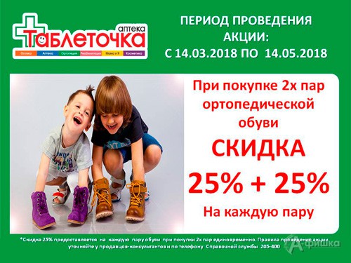 До 14 мая 2018 г. в сети аптечных магазинов «Таблеточка» в Белгороде проходит акция – при покупке двух пар ортопедической обуви скидка 25% на каждую пару!