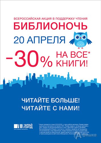 Ежегодная Всероссийская акция в поддержку чтения пройдёт и в сети книжных магазинов «Читай-город» Библионочь! Только 20 апреля 2018 г. скидка 30% на все книги!
