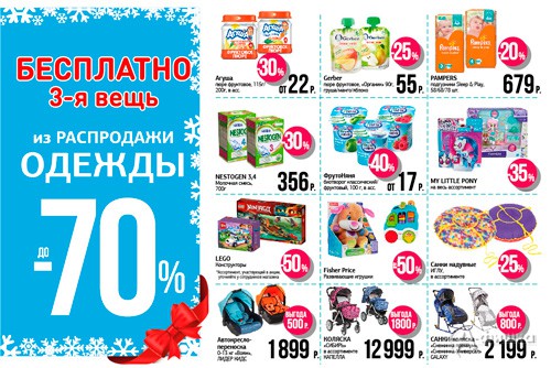В супермаркетах детских товаров «Дочки-Сыночки» проходит акция «Щедрые выходные» – с 18 по 21 января 2018 г. скидки до 70% на одежду и третья вещь бесплатно!
