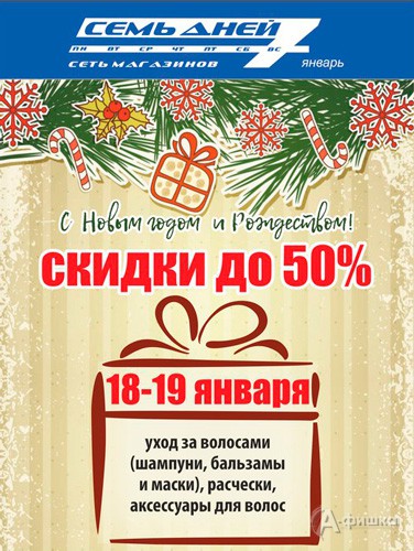 18 и 19 января 2018 г. в сети магазинов парфюмерии, косметики и бытовой химии «7 дней» в Белгороде скидки до 50% на уход за волосами (шампуни, бальзамы и маски), расчески, аксессуары для волос!