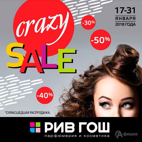 С 17 по 31 января 2018 г. в магазине парфюмерии и косметики «Рив Гош» проходит «Crazy Sale» – сумасшедшая распродажа! Скидки до 50% на любимые товары!