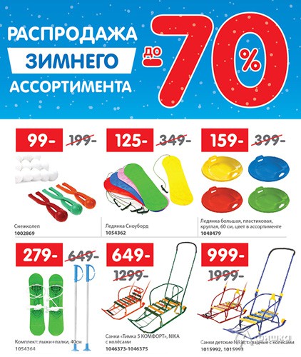 В гипермаркете игрушек «Бегемот» в Белгороде до 28 февраля 2018 г. проходит грандиозная распродажа зимнего ассортимента – скидки до 70% на все товары для зимнего отдыха!