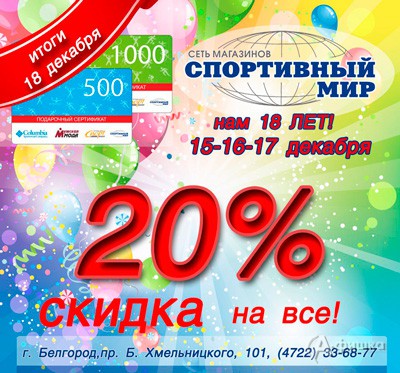 Магазину «Спортивный мир» 18 лет! В честь этого события с 15 по 17 декабря 2017 г. действует праздничная скидка 20% на всё!