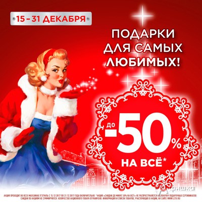 С 15 по 31 декабря 2017 г. в сети магазинов парфюмерии и косметики «Л’Этуаль» проходит акция «Подарки для самых любимых» – на всю косметику и парфюмерию скидки до 50%!