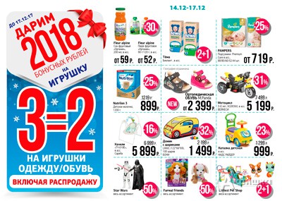 В супермаркетах детских товаров «Дочки-Сыночки» проходит акция «Щедрые выходные» – до 17 декабря 2017 г. акция «3=2» на всю одежду и обувь и более 5000 игрушек!