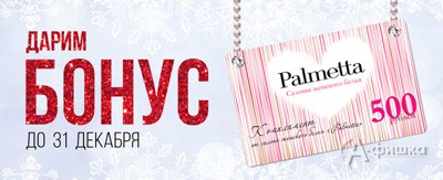 Новогодний комплимент в фирменных салонах женского белья «Palmetta»! С 14 по 31 декабря 2017 г. при покупке белья, купальников или подарочной карты Вы получите карту-бонус в подарок!