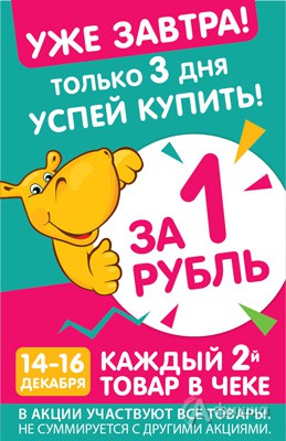 Только 3 дня в гипермаркете игрушек «Бегемот» в Белгороде специальное предложение – с 14 по 16 декабря 2017 г. каждый второй товар в чеке за 1 рубль!