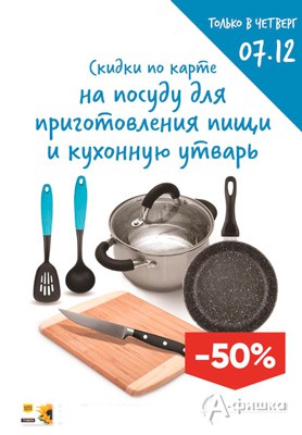 Только 7 декабря 2017 г. в гипермаркетах «Лента» в Белгороде скидка 50% на посуду для приготовления пищи и кухонную утварь по карте «Лента»!