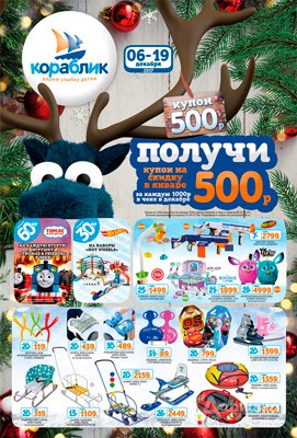 В детских магазинах «Кораблик» проходит акция – в период с 16 по 31 декабря 2017 г. за каждую 1000 руб. покупки в чеке выдаётся купон на скидку 500 руб.!