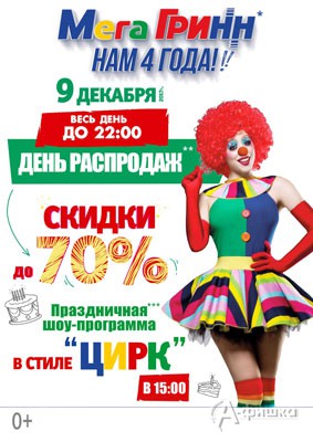 4 года ТРЦ «Мега ГРИНН» в Белгороде! В честь этого события 9 декабря 2017 г. объявлен Днём распродаж – весь день до 22:00 в магазинах центра будут действовать скидки до 70%!