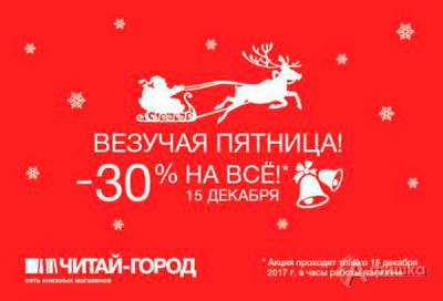 15 декабря 2017 г. в сети книжных магазинов «Читай-город» пройдет ежегодная акция «Везучая пятница» – в этот день на все книги и товары будет действовать скидка 30%!