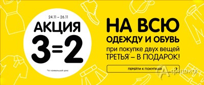 В магазинах «Детский мир» с 24 по 26 ноября 2017 г. проходит акция на всю одежду и обувь «3=2» – при покупке двух вещей третья в подарок!