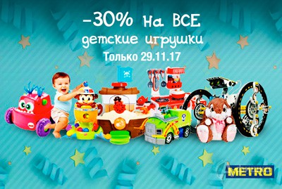 Только 29 ноября 2017 г. в «METRO Cash & Carry» в Белгороде скидка 30% на все детские игрушки! Мягкие игрушки, куклы, конструкторы, роботы, машинки – всё по выгодной цене!