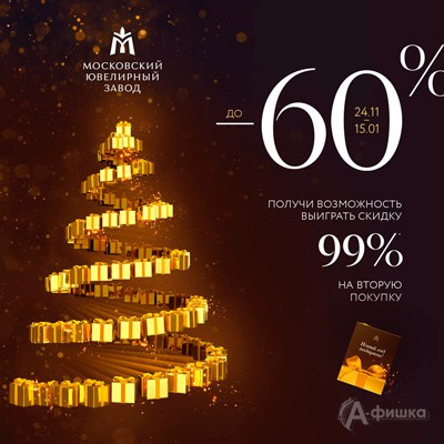 С 24 ноября 2017 г. по 15 января 2018 г. в магазинах «Московского ювелирного завода» праздничная акция «Новый год подарков» – скидки до 60% на золотые и платиновые украшения с драгоценными камнями!