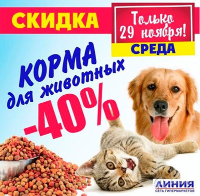 Только 29 ноября 2017 г. в гипермаркетах «Линия» в Белгороде проходит акция – действует скидка 40% на корма для животных!