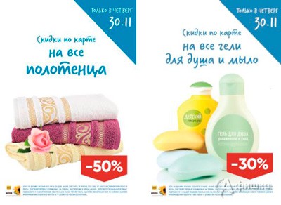 В гипермаркетах «Лента» в Белгороде акция – только 30 ноября 2017 г. скидка 50% на все текстильные полотенца и скидка 30% на гели для душа и мыло по карте «Лента»!