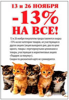 Только 13 и 26 ноября 2017 г. в сети магазинов косметики и бытовой химии «Идея» действует скидка 13% на все товары!