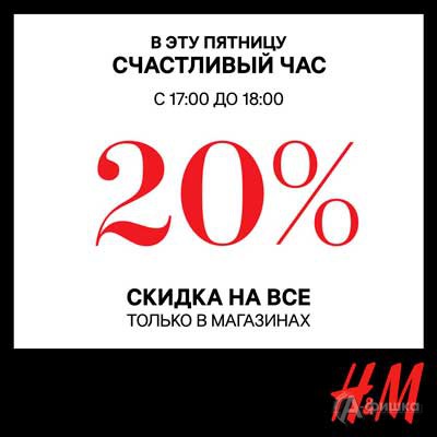 В магазине «H&M» в Белгороде акция «Счастливый час» продолжается – 10 ноября 2017 г. совершите покупку с 17:00 до 18:00 и получите скидку 20%!