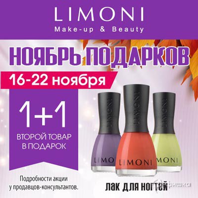 В фирменном магазине косметики «Limoni» в Белгороде с 16 по 22 ноября 2017 г. действует акция «1+1» – второй лак для ногтей в подарок!