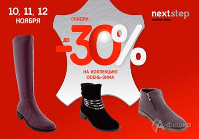 В салоне обуви и аксессуаров «Next Step» в Белгороде с 10 по 12 ноября 2017 г. действуют скидки до 30% на товары из коллекции «Осень-Зима 2017»!