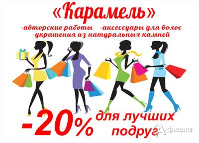 В отделе украшений, аксессуаров для волос и бижутерии «Карамель» с 1 ноября по 1 декабря 2017 г. проходит акция «Скидка для лучших подруг» – скидка 20% на украшения.