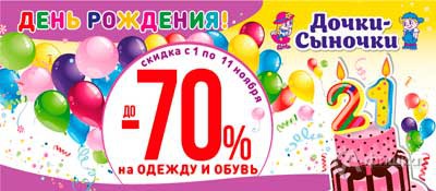 Супермаркеты детских товаров «Дочки-Сыночки» празднуют день рождения! С 1 по 11 ноября 2017 г. распродажа – скидки до 70% на одежду или обувь!