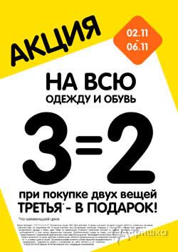 С 3 по 6 ноября 2017 г. в мультибрендовом аутлете «Chic & Cheap» и в отделе «Бабье лето» действует акция «1+1=3» – третья вещь в подарок!