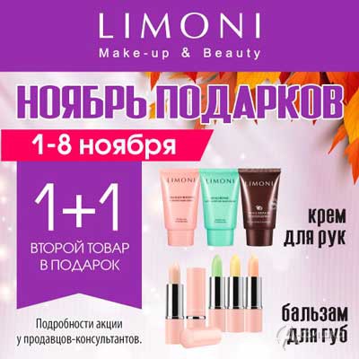 В фирменном магазине косметики «Limoni» в Белгороде с 1 по 11 ноября 2017 г. проходит акция «1+1» – при покупке любого крема для рук или любого бальзама для губ, второй Вы получаете в подарок!