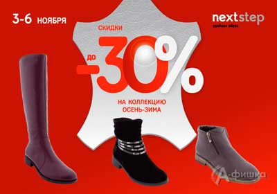В салоне обуви и аксессуаров «Next Step» в Белгороде с 3 по 6 ноября 2017 г. действуют праздничные скидки до 30% на обувь из коллекции «Осень-Зима 2017»!