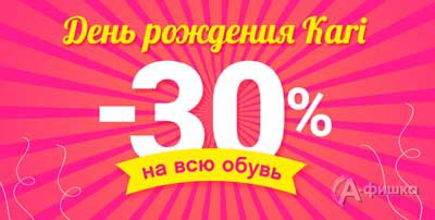 В магазинах обуви и аксессуаров «Kari» в Белгороде в честь дня рождения сети акция – со 2 по 12 ноября 2017 г. скидка 30% на всю обувь!