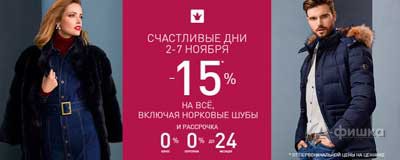 В магазине «Снежная Королева» в Белгороде со 2 по 7 ноября 2017 г. «Счастливые дни» – скидка 15% на всё, включая норковые шубы!
