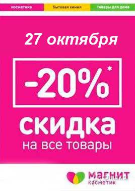В сети магазинов «Магнит Косметик» в Белгороде только 27 октября 2017 г. пройдёт выгодная акция – скидка 20% на все товары!