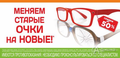 В салоне оптики «Счастливый взгляд» до 3 декабря 2017 г. проходит акция «Меняем старые очки на новые» – приносите свои старые очки и получите скидку 25% на линзы и оправы или скидку 50% на оправы!