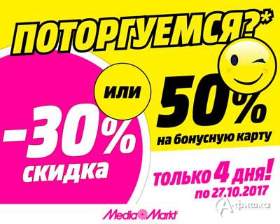 Только до 27 октября 2017 г. в магазине бытовой техники и электроники «Media Markt» проходит акция «Поторгуемся?» – выберите акционный товар и решите сами: получить скидку 30% от стоимости техники или начисление 50% от суммы на карту MediaMarkt Club!