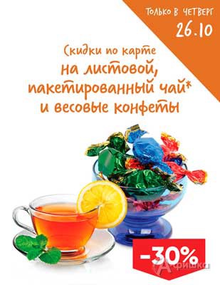 В гипермаркетах «Лента» в Белгороде акция – только 26 октября 2017 г. скидка 30% на весь листовой и пакетированный чай и весовые конфеты по карте «Лента»!
