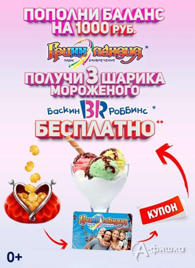 До 28 февраля 2017 г. в парке развлечений «Гриннландия» проходит акция – при пополнении баланса на 1000 руб. получите 3 шарика мороженого «Баскин Роббинс» бесплатно!
