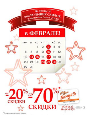 В сети магазинов косметики и бытовой химии «Санги Стиль» ежемесячно проходит акция «Дни больших скидок»! 3, 10, 14-15, 17, 23-25 февраля 2017 г. скидки от 20 до 70%!